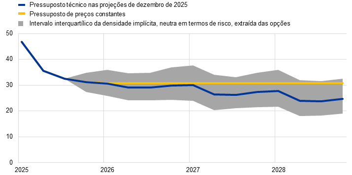 Nota: As densidades implícitas dos preços do petróleo e do gás são extraídas das cotações do mercado, em 26 de novembro de 2025, de opções em contratos de futuros de petróleo bruto Brent na “Intercontinental Exchange” (ICE) e em contratos de futuros de gás natural na facilidade de transferência de títulos neerlandesa, com datas de vencimento trimestrais fixas.