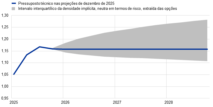 Notas: Um aumento implica uma apreciação do euro. Os percentis 25 e 75 referem‑se às densidades implícitas, neutras em termos de riscos, extraídas das opções para a taxa de câmbio USD/EUR em 26 de novembro de 2025.