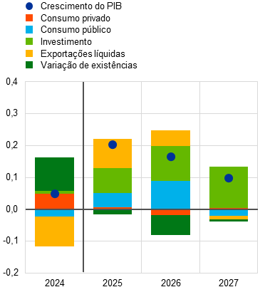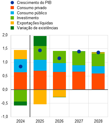 O crescimento do PIB real deverá continuar a ser impulsionado pela procura interna, com uma diminuição do contributo negativo das exportações líquidas para zero em 2027 e 2028. Da perspetiva da despesa (gráfico 3, painel a), projeta‑se que o consumo privado apresente um crescimento robusto durante o horizonte, proporcionando o maior contributo para o crescimento do PIB real. O fortalecimento da despesa das famílias deverá ser apoiado pelo aumento do seu poder de compra, refletindo um crescimento robusto dos salários e do emprego, num contexto de continuação da resiliência do mercado de trabalho. Além disso, o ritmo de crescimento do investimento deverá ser superior ao do PIB ao longo do horizonte. O investimento privado deverá compensar o abrandamento do investimento público em 2027 e 2028 resultante da cessação do financiamento ao abrigo do programa “NextGenerationEU” (NGEU). No horizonte de projeção, o crescimento do investimento deverá ser impulsionado pela redução da incerteza, pelo aumento das despesas em defesa e infraestruturas, pelo fortalecimento dos lucros e pela melhoria das condições da procura devido à recuperação cíclica. Em contraste, o crescimento das exportações deverá permanecer fraco, não obstante a melhoria da procura externa, com os persistentes desafios de competitividade da área do euro, os direitos aduaneiros impostos pelos Estados Unidos e a anterior apreciação do euro a pesar sobre o desempenho das exportações. Tal deverá conduzir a perdas contínuas de quota de mercado das exportações. Consequentemente, projetam‑se contributos negativos das exportações líquidas para o crescimento do PIB real em 2025 e 2026, com o crescimento das importações a ultrapassar o crescimento das exportações. Considera‑se que esses contributos negativos são parcialmente compensados por um contributo positivo da variação de existências em 2025.