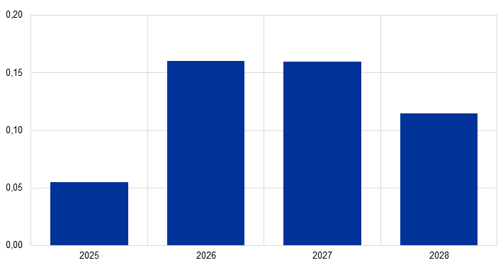 Ročný rast reálneho HDP by mal počas sledovaného obdobia dosiahnuť v priemere 1,3 %, k čomu by mal prispieť rast reálneho disponibilného príjmu, ustupujúca neistota, silný zahraničný dopyt a rozpočtové stimuly súvisiace s výdavkami na obranu a infraštruktúru. Tieto rozpočtové stimuly, na ktorých sa podieľa najmä Nemecko, by mali v strednodobom horizonte stimulovať rast HDP eurozóny, ktorý by mal do roku 2028 kumulatívne dosiahnuť 0,5 %, pričom najvyšší vplyv na rast sa očakáva v rokoch 2026 a 2027 (graf 2).[9] Odhadovaný mierny pokles rastu reálneho HDP z 1,4 % v roku 2025 na 1,2 % v roku 2026 sa považuje za dôsledok nižších prenosových účinkov v roku 2026 po očakávanom o niečo miernejšom raste v druhej polovici roka 2025. V dôsledku silnejúcich prenosových účinkov by sa mal ročný rast reálneho HDP následne zvýšiť a v rokoch 2027 a 2028 by sa mal stabilizovať na úrovni 1,4 % vzhľadom na podobný príspevok prenosových účinkov a vývoja v rámci roka počas týchto dvoch rokov. Ak sa v prípade Írska namiesto írskeho HDP použije modifikovaný domáci dopyt, rast reálneho HDP eurozóny by sa mal zvyšovať pozvoľnejšie, z 1,0 % v roku 2025 na 1,1 % v roku 2026 a na 1,3 % v rokoch 2027 a 2028.
