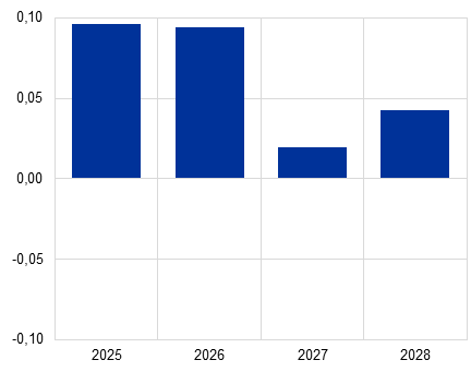 Vpliv na inflacijo, vključen v osnovno projekcijo, je po ocenah manjši od 0,1 odstotne točke kumulativno v obdobju 2025–2028.