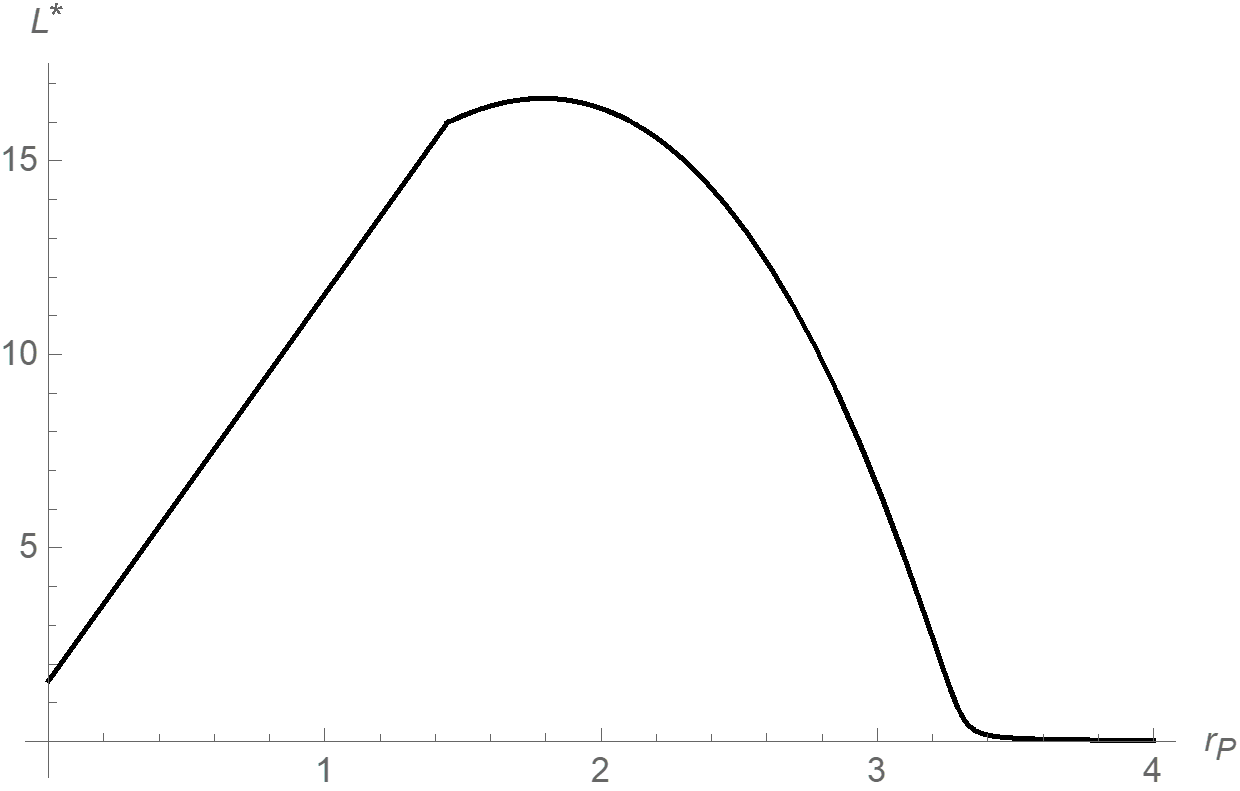 Notes: The figure illustrates how bank lending, denoted with L* changes with the policy rate r P . The level of the policy rate at which lending is maximal identifies the reversal rate.