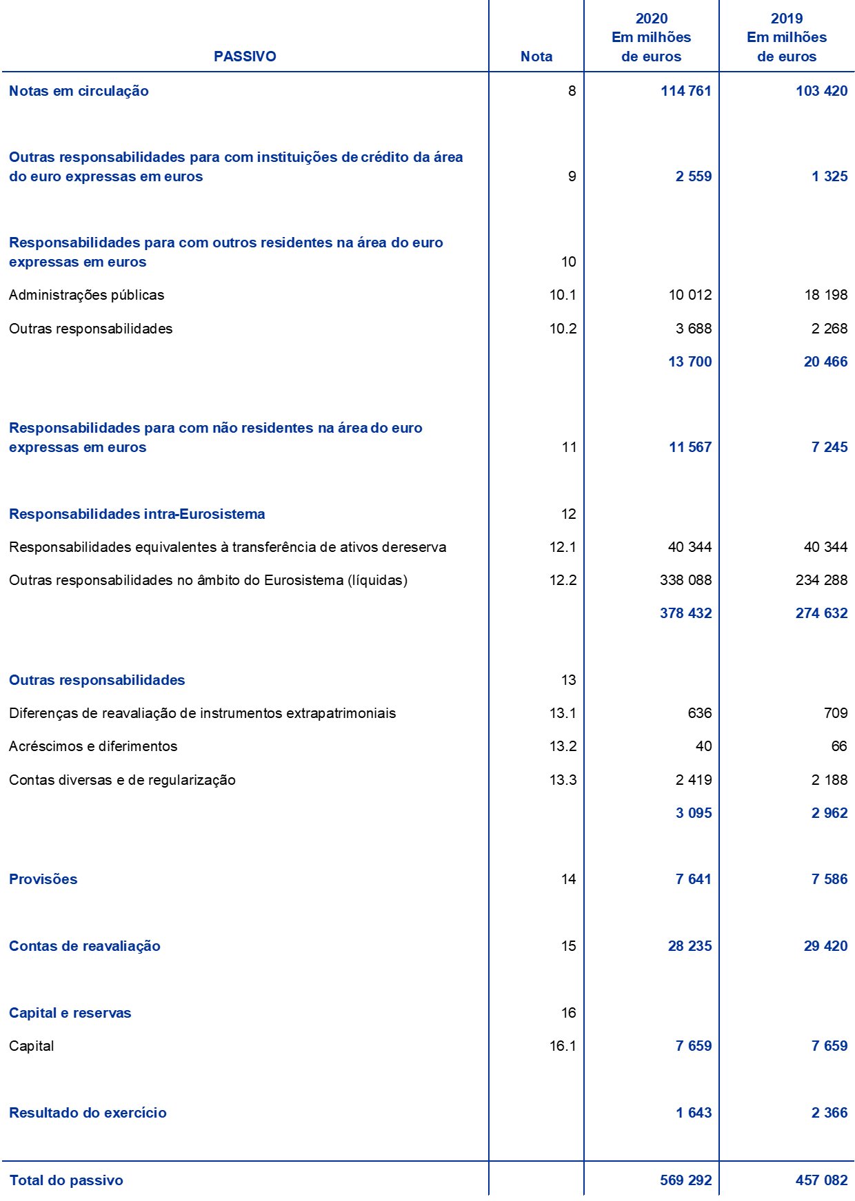 No final de 2020, o valor total das notas de euro em circulação ascendia a 1434,5 mil milhões de euros, o que corresponde a um aumento de 11% em comparação com o final de 2019. Ao BCE foi atribuída uma participação de 8% no valor total de notas de euro em circulação, a qual correspondia a 114,8 mil milhões de euros no final do ano. Dado que o BCE não emite notas de euro, detém créditos intra‑Eurosistema sobre os BCN da área do euro de montante correspondente ao valor das notas de euro em circulação.