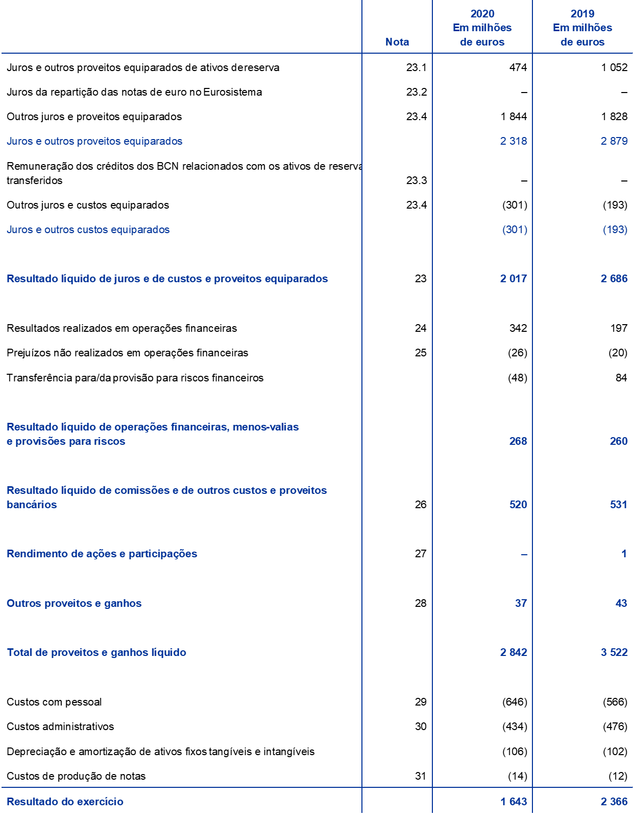 Em 2020, o resultado líquido do BCE foi de 1643 milhões de euros (2366 milhões de euros, em 2019). A diminuição de 722 milhões de euros, em comparação com 2019, deveu‑se principalmente ao menor resultado líquido de juros e de custos e proveitos equiparados.