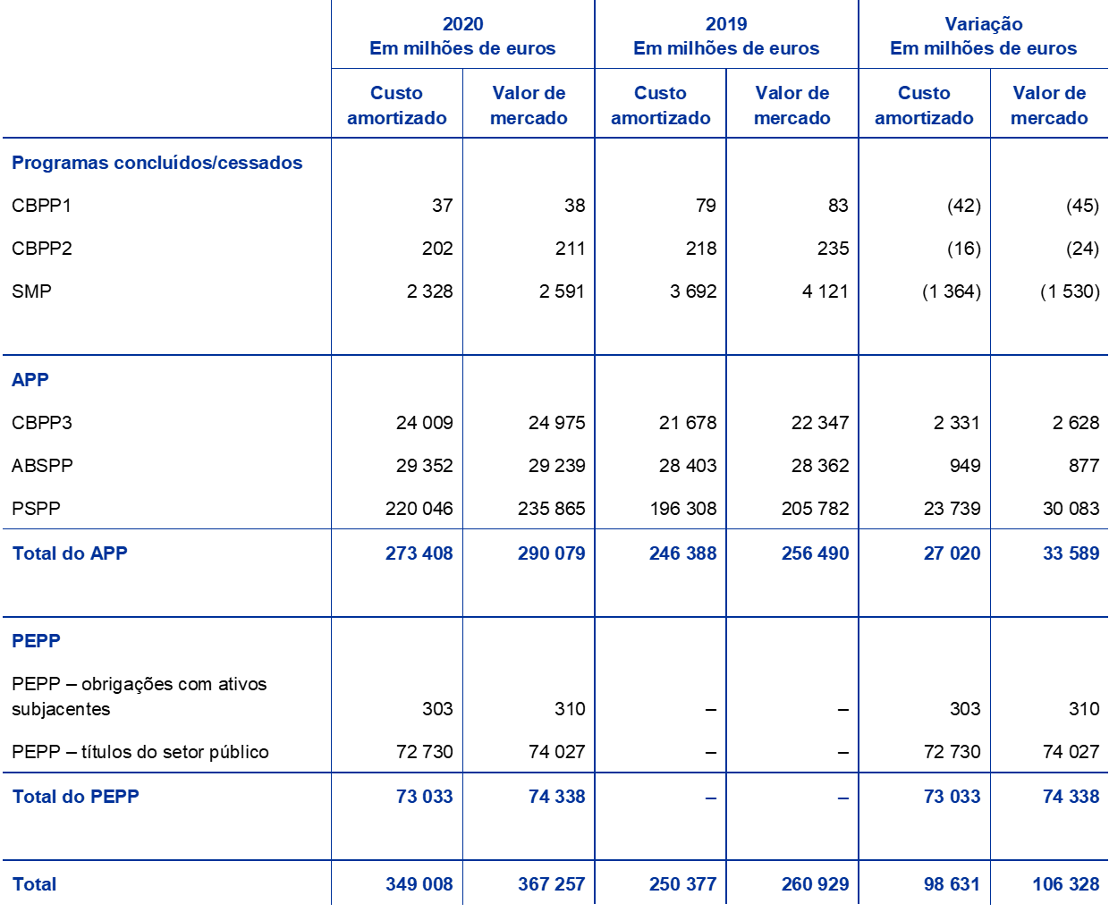 Em resultado das aquisições, a carteira de títulos detidos pelo BCE para fins de política monetária aumentou 98,6 mil milhões de euros, passando para 349,0 mil milhões de euros em 2020 (ver o gráfico 2), sendo as compras no contexto do PEPP responsáveis pela maior parte deste aumento. A diminuição das posições em ativos detidos ao abrigo do SMP, do CBPP1 e do CBPP2 deveu‑se a reembolsos e ascendeu a 1,4 mil milhões de euros.