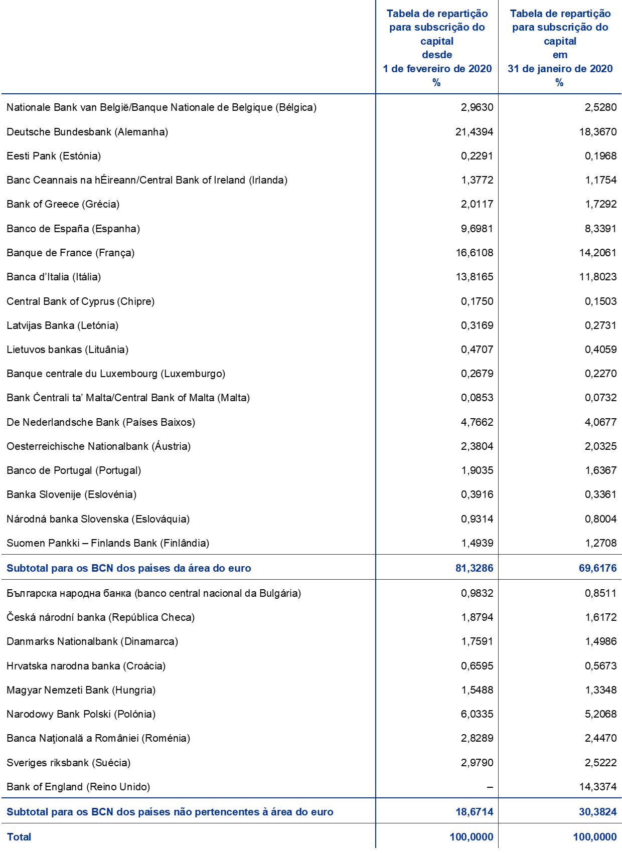 - Ver o comunicado de 30 de janeiro de 2020 sobre o capital subscrito do BCE no seguimento da saída do Bank of England do SEBC.