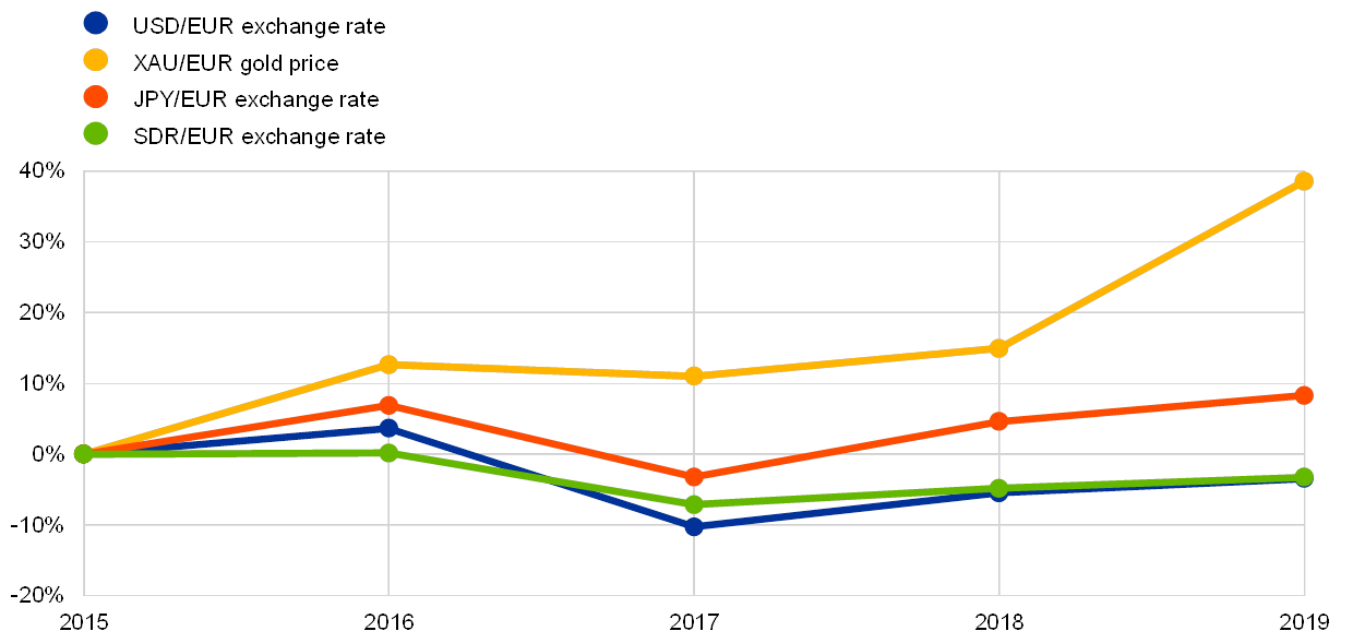 Chart 5 below shows the development of the price of gold and of the main foreign currencies against the euro during the period 2015-2019.