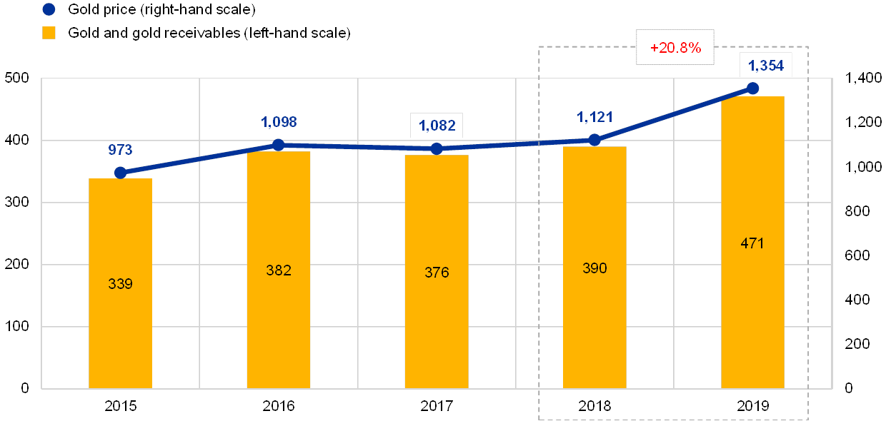 (left-hand scale: EUR billions; right-hand scale: EUR per fine ounce of gold)