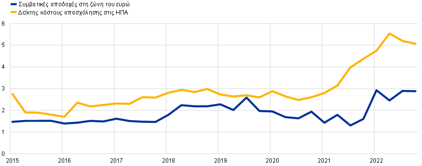 Βλ. το πλαίσιο με τίτλο “Comparing labour market developments in the euro area and the United States and their impact on wages” στο άρθρο “Wage developments and their determinants since the start of the pandemic”, Economic Bulletin, Issue 8, ECB, 2022.