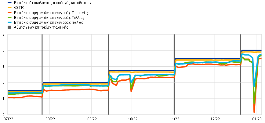 Έτσι, τον Δεκέμβριο, μετά την τελευταία συνεδρίαση νομισματικής πολιτικής του έτους, ανακοινώσαμε ότι τα επιτόκια θα πρέπει ακόμη να αυξηθούν σημαντικά με σταθερό ρυθμό προκειμένου να διαμορφωθούν σε επίπεδα που είναι επαρκώς περιοριστικά για να διασφαλιστεί η έγκαιρη επαναφορά του πληθωρισμού στον στόχο μας. Ταυτόχρονα, ανακοινώσαμε ότι, ενώ τα βασικά επιτόκια της ΕΚΤ είναι το πρωταρχικό εργαλείο μας μέσω του οποίου καθορίζουμε την κατεύθυνση της πολιτικής μας, από τον Μάρτιο του 2023 θα αρχίσουμε να συρρικνώνουμε το χαρτοφυλάκιο τίτλων του APP με μετρημένο και προβλέψιμο ρυθμό. Είχε προηγηθεί τον Οκτώβριο η απόφασή μας να τροποποιήσουμε τους όρους των πράξεων TLTRO III, εξαλείφοντας τα αντικίνητρα για την οικειοθελή πρόωρη αποπληρωμή τους. Τα στοιχεία ενεργητικού στον ισολογισμό μας που συνδέονται με τη νομισματική πολιτική μειώθηκαν κατά 830 δισεκ. ευρώ περίπου από το τέλος Ιουνίου (οπότε τερματίστηκαν οι καθαρές αγορές τίτλων) μέχρι το τέλος Δεκεμβρίου, συμβάλλοντας στην ομαλοποίηση του μεγέθους του ισολογισμού μας.