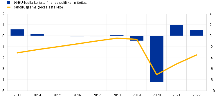Huom. Finanssipolitiikan mitoituksen mittari ottaa huomioon EU:n elpymisrahasto NGEU:n, elpymis- ja palautumistukivälineen (RRF) ja muiden EU:n rakennerahastojen tuella rahoitetut menot.