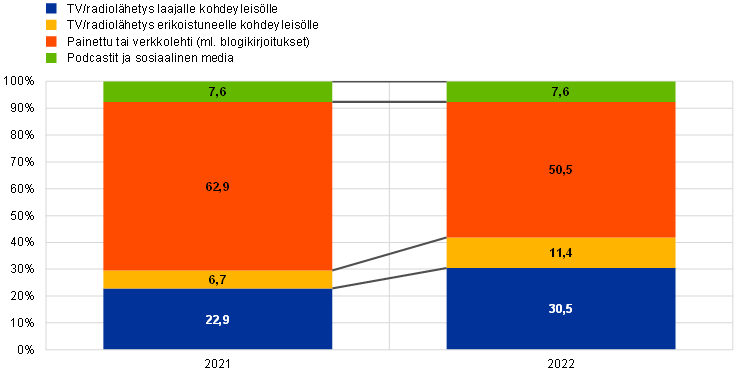 Vuonna 2022 rahapoliittista tukea vähennettiin ja finanssipolitiikassa keskityttiin suojautumaan energian hinnan nousua vastaan. Vaikka rahapolitiikan linjauksen normalisointi aloitettiin jo joulukuussa 2021, rahapoliittiset toimet olivat edelleen yleisesti ottaen kasvua tukevia erityisesti vuoden alkupuoliskolla. Vuoden jälkipuoliskolla rahapoliittista tukea alettiin kuitenkin ajaa alas nopeasti ja ennennäkemättömän suurin harppauksin (ks. osa 2.1). Euroalueen maat toteuttivat finanssipoliittisia toimia, joilla pyrittiin kompensoimaan energian hinnannousun vaikutusta. Toimet olivat suurelta osin kohdentamattomia sen sijaan, että ne olisi kohdistettu ensisijaisesti haavoittuvimmassa asemassa oleville kotitalouksille ja yrityksille. Noin puolet toimenpiteistä vaikutti pikemminkin energian kulutuksen rajakustannukseen, eikä niitä räätälöity tarjoamaan kannustimia energiankulutuksen vähentämiseen. Samaan aikaan jatkettiin rakennepolitiikkaa, jolla pyrittiin lisäämään euroalueen kasvupotentiaalia. Next Generation EU (NGEU) -ohjelman alaisten jäsenvaltioiden investointi- ja rakenneuudistusohjelmien toteutus jatkui ja vaikutti osaltaan merkittävästi näiden tavoitteiden saavuttamiseen.
