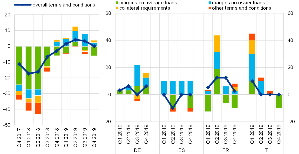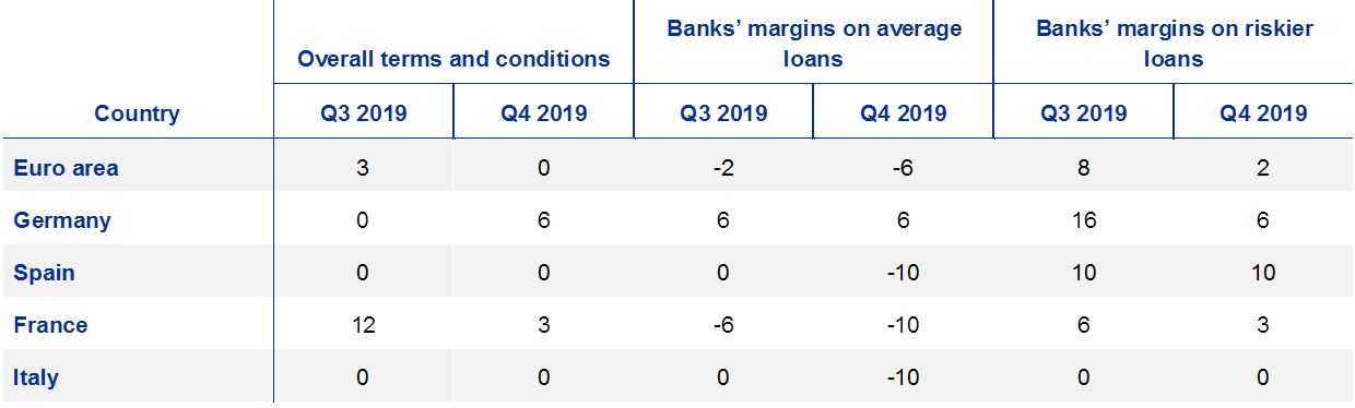 Looking at the four largest euro area countries, overall terms and conditions on new loans or credit lines to enterprises tightened in Germany and France, while they remained unchanged in Spain and Italy. That tightening was driven mainly by a widening of margins on riskier loans. In Germany and France, collateral requirements exerted a tightening impact, while non-interest rate charges had a tightening impact overall in France and Spain. According to reporting banks, margins on average loans narrowed in Spain, France and Italy in the fourth quarter of 2019.