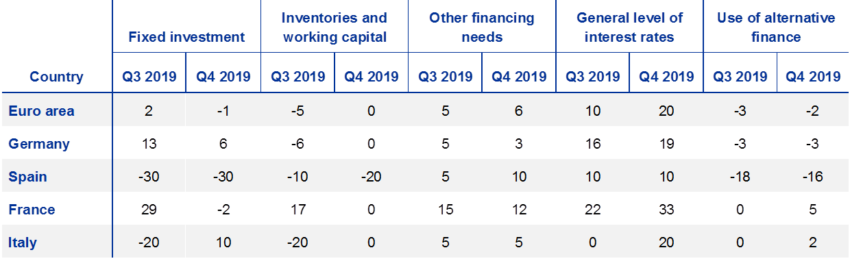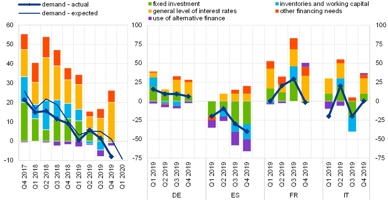 Looking at the largest euro area countries, net demand for loans to enterprises declined in Spain and, to a lesser extent, France, while net demand increased in Germany and remained unchanged in Italy. Spain’s net decline in demand for loans to enterprises was driven by fixed investment, inventories and working capital, as well as the use of alternative finance. In contrast, the low general level of interest rates supported loan demand in all major euro area countries.
