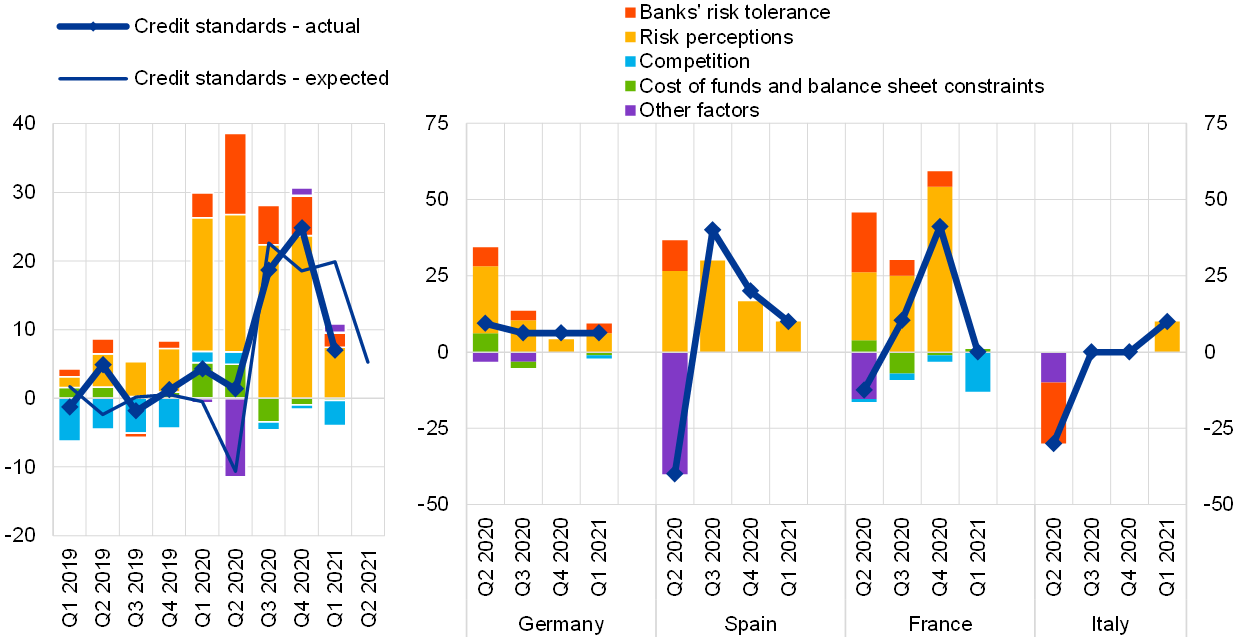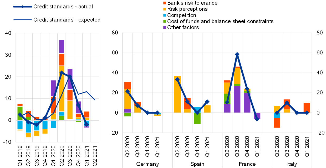 Notes: “Actual” values are changes that have occurred, while “expected” values are changes anticipated by banks. Net percentages are defined as the difference between the sum of the percentages of banks responding “tightened considerably” and “tightened somewhat” and the sum of the percentages of banks responding “eased somewhat” and “eased considerably”. The net percentages for responses to questions related to contributing factors are defined as the difference between the percentage of banks reporting that the given factor contributed to a tightening and the percentage reporting that it contributed to an easing. “Cost of funds and balance sheet constraints” is the unweighted average of “costs related to capital position”, “access to market financing” and “liquidity position”; “risk perceptions” is the unweighted average of “general economic situation and outlook”, “industry or firm-specific situation and outlook/borrower’s creditworthiness” and “risk related to the collateral demanded”; “competition” is the unweighted average of “competition from other banks”, “competition from non-banks” and “competition from market financing”. The net percentages for “other factors” refer to further factors which were mentioned by banks as having contributed to changes in credit standards, currently mainly related to the policy interventions in response to the COVID-19 pandemic.