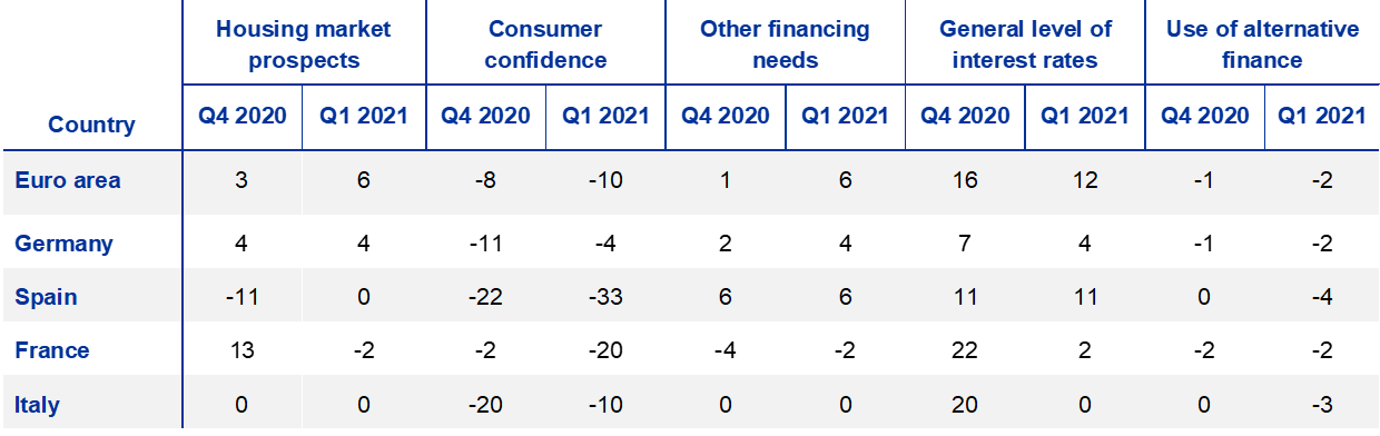 Banks reported, on balance, a decline in demand for housing loans in the first quarter of 2021 after increases in the previous two quarters (net percentage of banks standing at -7%, after 16% in the fourth quarter of 2020; see Overview table) as well as a stronger decrease in demand for consumer credit (net percentage of -24%, after -9%). The net decline in demand for loans to households was linked to lower consumer confidence, while the general level of interest rates had a positive impact on demand. In addition, housing market prospects and other financing needs contributed positively to demand for housing loans, while lower spending on durables and the use of alternative finance contributed negatively to demand for consumer credit. Banks expect a net increase in demand for housing loans (6%) and for consumer credit (13%) in the second quarter of 2021.