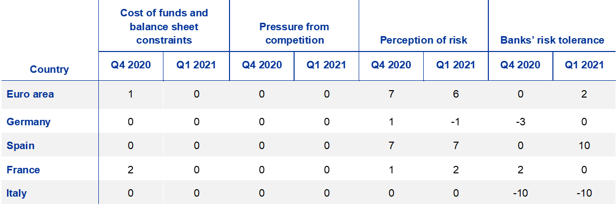 Across the largest euro area countries, credit standards for loans to enterprises tightened in Germany, Spain and Italy, while they remained unchanged in France in the first quarter of 2021 (see Overview table). Credit standards for housing loans tightened in Spain, while they remained unchanged in Germany and Italy, and eased in France. Credit standards for consumer credit and other lending to households tightened in Spain, remained unchanged in France and eased in Germany and Italy.