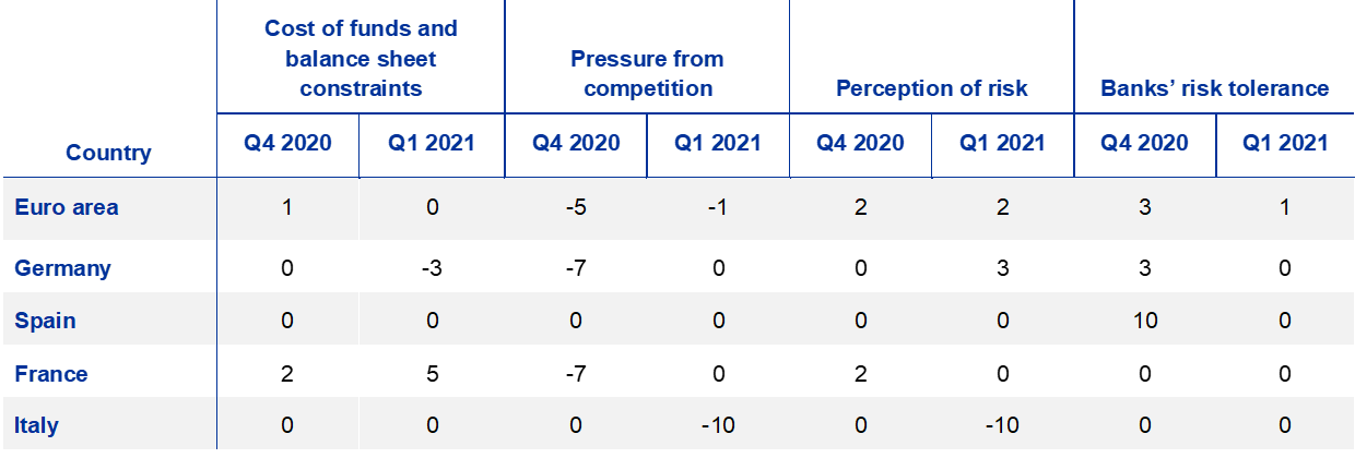 Across the largest euro area countries, credit standards on loans to enterprises tightened moderately in Germany, Spain and Italy in the first quarter of 2021. By contrast, credit standards remained unchanged in France, for both SMEs and large firms, following a strong tightening in the previous quarter. In Germany, Spain and Italy, risk perceptions remained the main factor contributing to a tightening of credit standards, while there was no further tightening impact for this factor reported by banks in France. Banks in Germany and especially in France also referred to easing pressure from competition, specifically from other banks, and for French banks also from non-banks and market-based financing. Banks’ cost of funds and balance sheet situation had a broadly neutral impact in all the largest euro area countries.