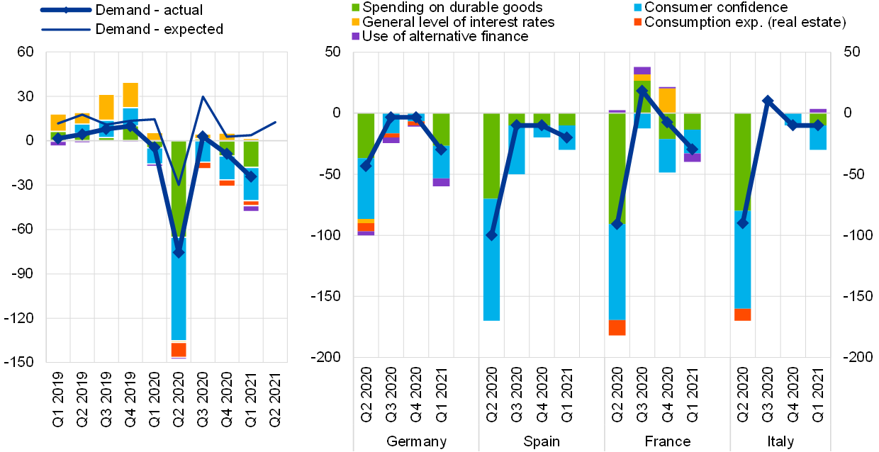 Across the largest euro area countries, banks reported, on balance, an increase in demand for loans to enterprises in Germany and Italy, but a continued decline in France and Spain in the first quarter of 2021. Net demand for housing loans declined in France, Spain and Italy, while it remained unchanged in Germany. Net demand for consumer credit continued to decline across all four largest euro area countries.