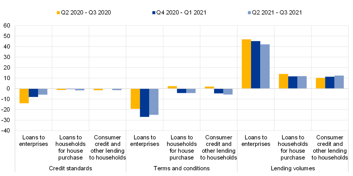 The net tightening of credit standards moderated significantly for loans to both SMEs (7%, after 25%) and large firms (5%, after 16%) as well as for short-term loans (6%, after 19%) and long-term loans (10%, after 26%). The fact that differences were limited across firm sizes shows the beneficial impact of public support measures especially for SMEs, given the typically higher credit risk associated with the latter also due to their potentially opaque balance sheets.