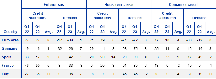 Banks reported a net decrease in demand for loans across all four largest euro area countries in the first quarter of 2023. Across all four largest countries, demand for loans to enterprises decreased in net terms. In addition, net demand for housing loans decreased substantially in all four largest euro area countries, with very large net decreases in Germany, Spain and France. Demand for consumer credit decreased in net terms in Germany, Spain and, to a lesser extent, in Italy, while it remained unchanged in France.