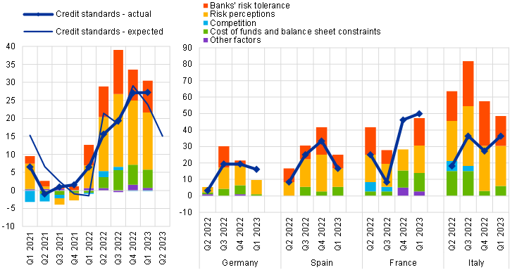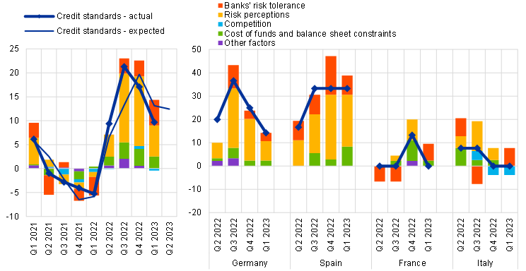 Credit standards for loans to enterprises tightened in net terms in all four of the largest euro area countries in the first quarter of 2023 (see Overview table). Credit standards for housing loans also tightened across all four largest euro area countries in the first quarter, while credit standards for consumer credit and other lending to households tightened in Germany and Spain and remained unchanged in France and Italy.