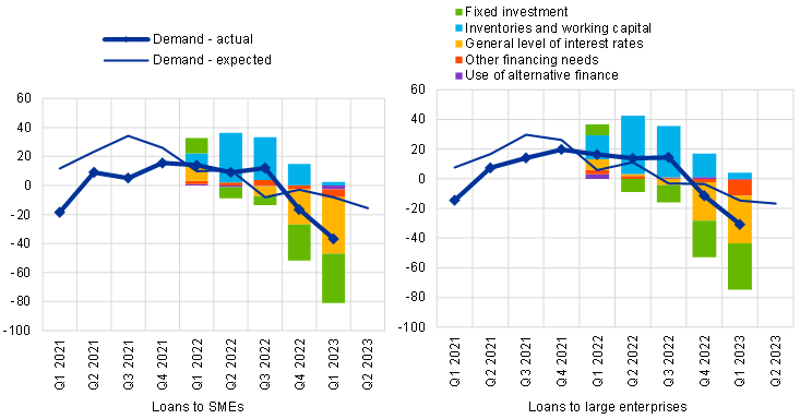 Firms’ net demand for loans fell strongly in the first quarter of 2023. The decline in net demand was stronger than expected by banks in the previous quarter and the strongest since the global financial crisis. The general level of interest rates was reported as the main driver of reduced loan demand, in an environment of monetary policy tightening. Fixed investment also had a strong dampening impact while the impact of inventories and working capital turned broadly neutral, after having previously had a positive impact on loan demand. In the second quarter of 2023, banks expect a further, albeit smaller net decline in demand for loans to firms.