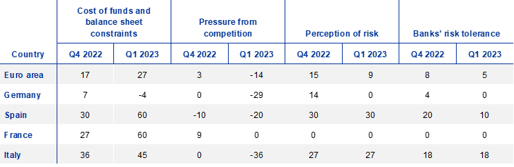 Across all four of the largest euro area countries, overall terms and conditions for consumer credit and other lending to households tightened in net terms. Banks in Germany and Spain reported a widening of loan margins, reflecting the pass-through of higher market rates to lending rates for consumers. By contrast, banks in Italy referred to a narrowing of loan margins in the first quarter, related to the further increase in the general level of interest rates (included in “other factors”), which has not yet been fully passed through to borrowers. Banks in France reported a net tightening of their terms and conditions in the first quarter partly on account of the monthly update of the usury rate (see footnote 5 above). In all of the largest countries, both banks’ cost of funds and balance sheet situation as well as risk perceptions played a relevant role in the tightening of terms and conditions, while competition contributed to an easing in Spain and Italy.