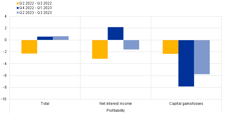 Euro area banks indicated a markedly positive impact of the ECB key interest rate decisions on their net interest margins over the past six months, according to a new question which was introduced in this survey round. The positive impact on bank interest margins also translated into a high share of banks reporting a positive impact of the ECB rate hikes on their net interest income, which led to a largely positive effect on their overall profitability. At the same time, the impact of the interest rate decisions on volumes was negative, consistent with sharply decelerating loan demand as reported elsewhere in the survey and weakening deposit dynamics. Moreover, euro area banks reported a negative impact of the ECB interest rate decisions on their non-interest income, due to both capital losses and lower net fee and commission income, and a negative impact via higher provisioning needs and impairments. Banks expect mostly similar impacts of the ECB key interest rate decisions on the components of bank profitability over the next six months, except for capital losses, which banks expect to be lower.