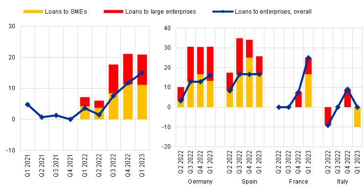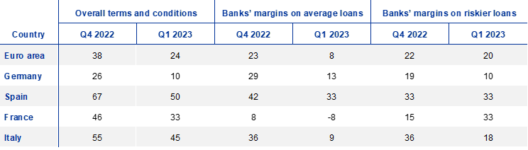 Banks in France, Germany and Spain reported a net increase in the share of rejected applications for loans to firms in the first quarter of 2023, while there was no change in the share of rejected applications in Italy. The net share of rejected loan application increased for both SMEs and large enterprises in Germany, France and Spain, while the share of rejected applications slightly decreased for SMEs in Italy.