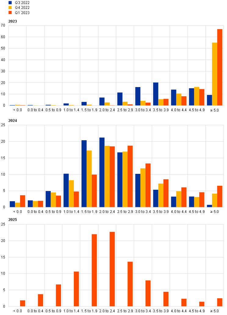 Notes: The SPF asks respondents to report their point forecasts and to separately assign probabilities to different ranges of outcomes. This chart shows the average probabilities they assigned to different ranges of inflation outcomes in 2023, 2024 and 2025. To minimise the number of bins in the questionnaire, the upper bin for inflation outcomes was set to ≥ 5.0%. The fact that this would lead to most probability being assigned to the upper bin for some horizons was flagged to respondents when sending out the questionnaire.